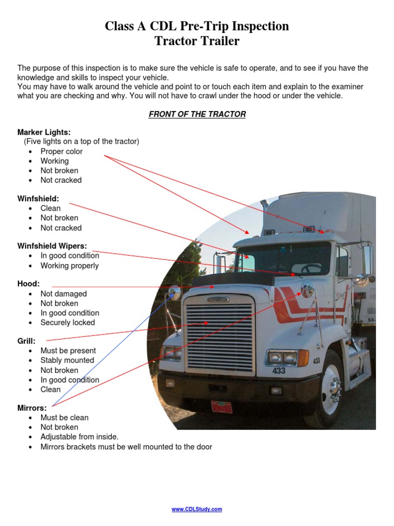 Ad Class A CDL Pre-Trip Inspection More Fillable Forms Register and Subscribe Now. Inspect from the top down and center out. CDL Pre-Trip Inspection Study Aid Combination Vehicles Front of Vehicle LightsReflectors Engine Compartment Steering Components Steering Axle.